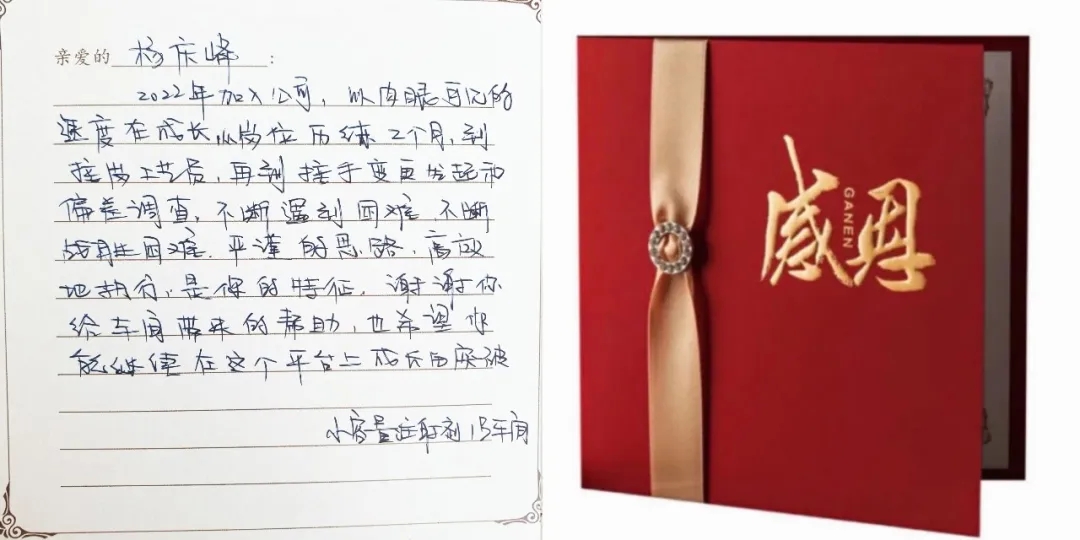 感謝卡:2022年加入公司,以肉眼可見的速度在成長(zhǎng),從崗位歷練2個(gè)月,到接崗工藝員,再到接手變更發(fā)起和偏差調(diào)查,不斷遇到困難,不斷戰(zhàn)勝困難。嚴(yán)謹(jǐn)?shù)乃悸?,高效地?zhí)行,是你的特征,謝謝你給車間帶來(lái)的幫助,也希望你能繼續(xù)在這個(gè)平臺(tái)上成長(zhǎng)和突破。