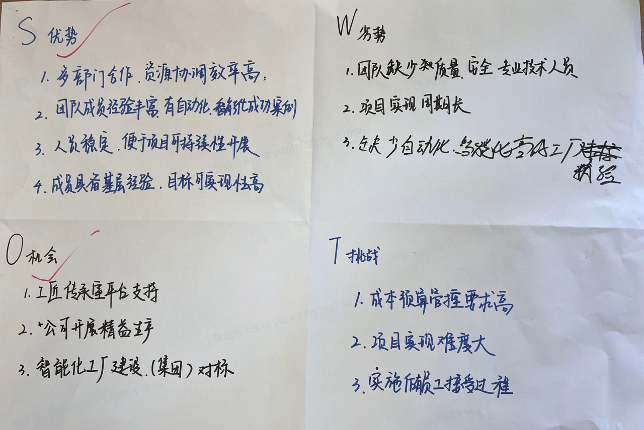 5月28日,海陵8個工匠傳承室參與了2024-2025年度的行動學習共創(chuàng)會,各自明確了本傳承室新一年度目標,碰撞出思維火花,共創(chuàng)分解指標。其中王志鵬傳承室深知,在快速變化的工業(yè)4.0時代,自動化與智能化是提升生產(chǎn)效率、保證產(chǎn)品質(zhì)量的關(guān)鍵。因此,他們將目光聚焦于未來,確立了打造自動化智能車間的愿景。這一愿景不僅承載著對技術(shù)進步的追求,更蘊含著對工匠精神的傳承與創(chuàng)新?;谠妇?,王志鵬傳承室設(shè)置了三個關(guān)鍵目標,進行了SWOT分析與策略制定。