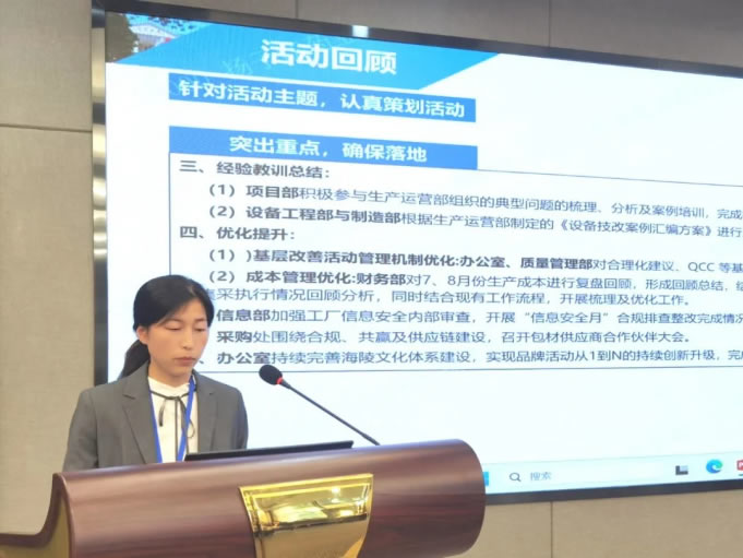 馮部長對第三十六次“質量月”活動進行總結發(fā)言。圍繞本次活動內容、不足與改進以及承上啟下內容進行展開:1)在總結中,她通過正反面案例展示活動期間各部門的亮點工作和不足;2)她強調要強化質量月內容與標準模板的解讀,保證材料輸出的質量;3)最后,她針對質量管理部制定的崗位“放心人”選拔方案進行解讀,希望大生產系統(tǒng)各部門能夠選拔更多的放心人,挖掘新生力量,推動企業(yè)不斷成長。