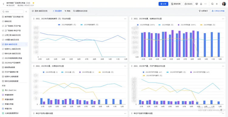 最終完成的儀表盤,改變了廠區(qū)能耗數(shù)據(jù)收集困難、分析困難、及時性低的問題。通過儀表盤這一新工具將原本獨立的數(shù)據(jù)整合起來,橫可看每月數(shù)據(jù)變化,縱可查往年同比增長,小可看單體設(shè)備耗能,大可覽全廠能耗起伏。在海陵實現(xiàn)能源精細化管理、節(jié)能減排和成本控制目標(biāo)的道路上給予了幫助。項鈺茹還帶著這個儀表盤參與了9月20日的海陵飛書案例大賽,取得了二等獎的好成績。