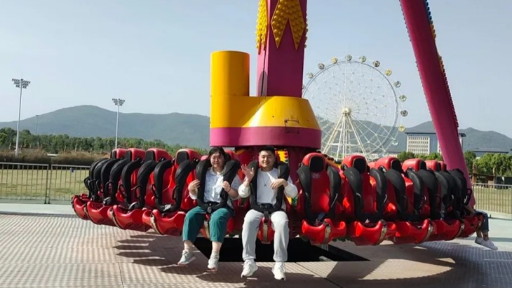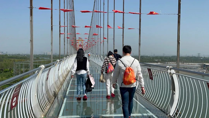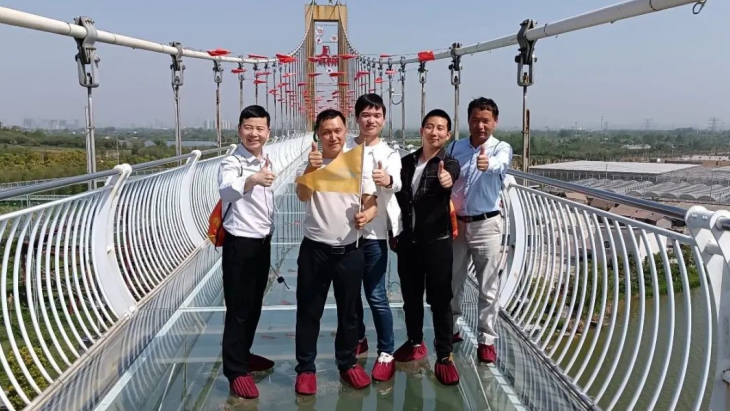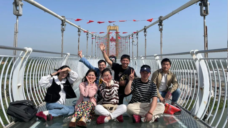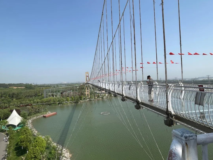 午后升溫的烈日下,完成競賽的成員三五成群的來到游樂設(shè)施區(qū)域。最火爆的項目非“鵲橋”——高空玻璃棧道莫屬。