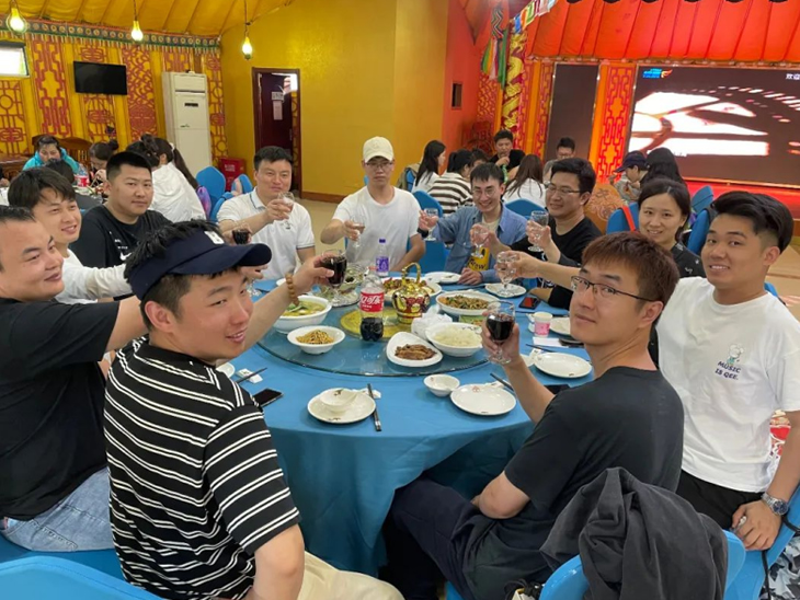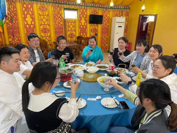 結(jié)束頒獎后,一行人談笑風(fēng)生地步行前往“蒙古大營”,走進用餐區(qū),一個個或大或小的蒙古包映入眼簾,落日余暉下的風(fēng)景讓人深感民族特色。大家圍坐在桌旁,享用美味晚餐,幸運的我們還觀賞到蒙古族歌曲、舞蹈、和馬頭琴的驚喜表演。